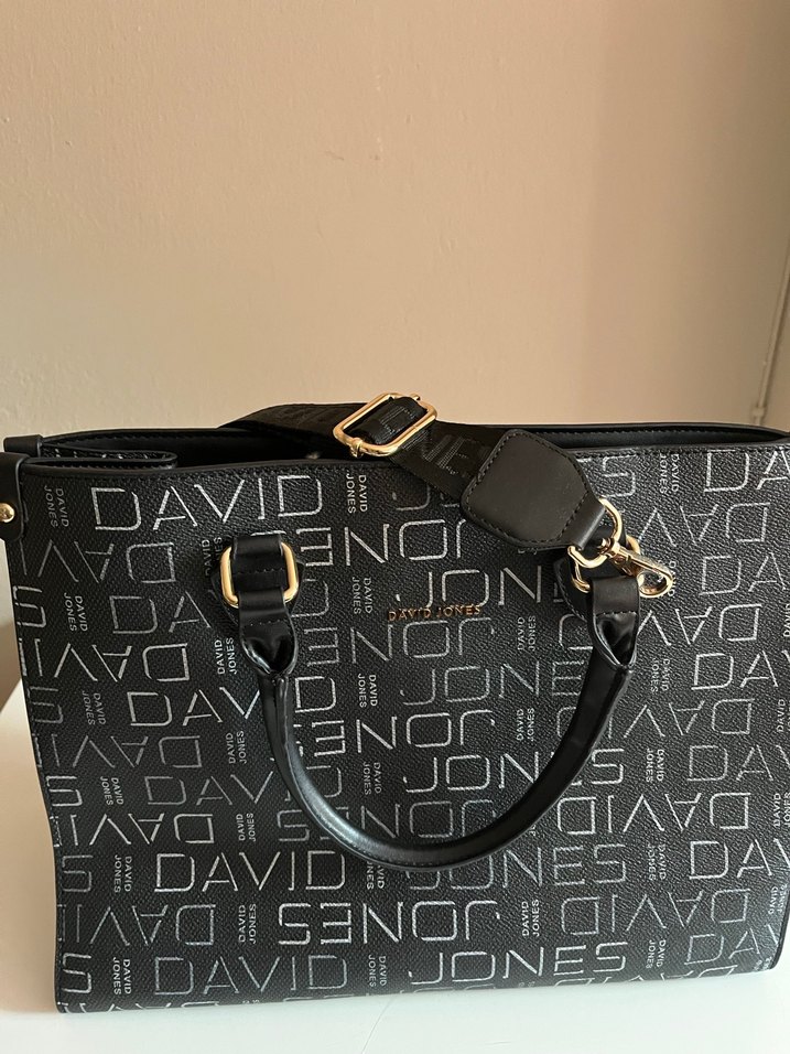 David Jones baskılı siyah deri kadın çantası, tokalı askılarla. Sokak stili ve günlük kullanıma uygun.