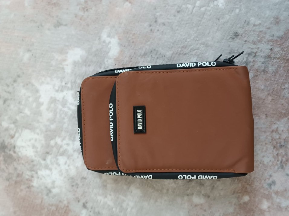 David Polo markalı, fermuarlı kahverengi cüzdan. siyah baskılı detaylarla sokak stiline uygun, trend bir model.