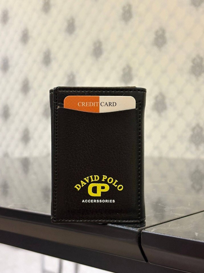 Siyah erkek deri cüzdan, David Polo baskılı, kartlar için çoklu bölmeler içerir.