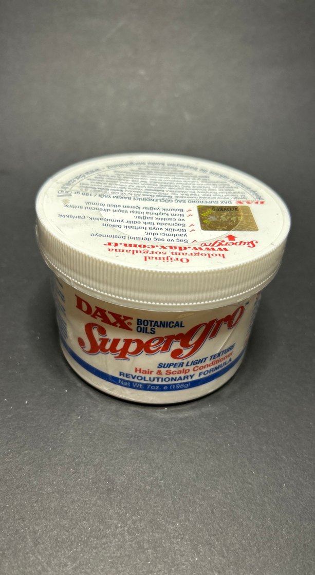 DAX Supergro saç ve saç derisi kremi, bitkisel yağlar içerir ve hafif dokusuyla saç bakımını destekler. 7oz kutuda sunulur.