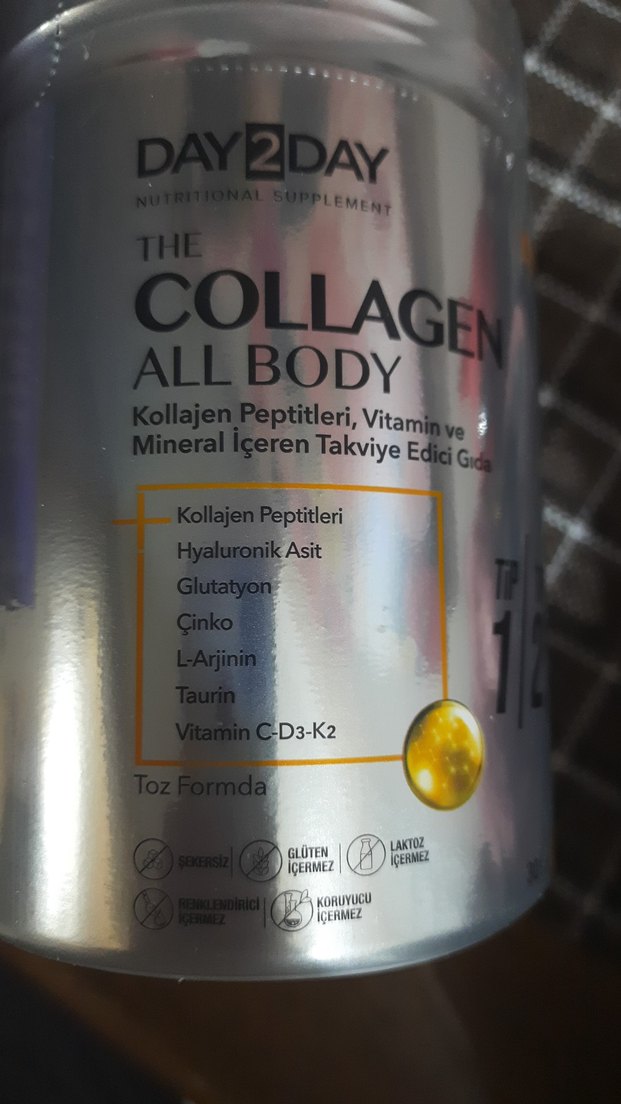 Day2Day Collagen All Body, kollajen peptitleri, hyaluronik asit, glutatyon, çinko, L-arjinin, taurin ve C-D3-K2 vitaminleri içeren hafif altın renkli toz takviyedir. Gluten ve laktoz içermez. ✨