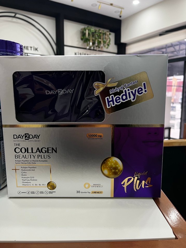 Day2Day Collagen Beauty Plus, 10.000 mg kolajen peptit, vitamin ve antioksidan içeren 30 sıvı shot ile cilt ve saç sağlığını destekler. Hediye çantasıyla birlikte.