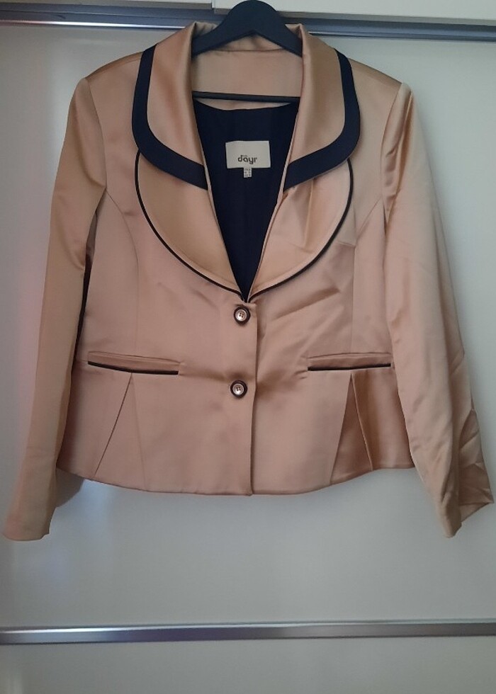 Dayi marka koyu bej saten 48 beden ama 44 bedene olur ceket gogus 55 boy 60 cm etek bel 46 cm basen 60 boy 93 cm sadece 1 kere giyildi alana ceketin ayni renginden esarp hediye ki5afetle takmak icin almistim