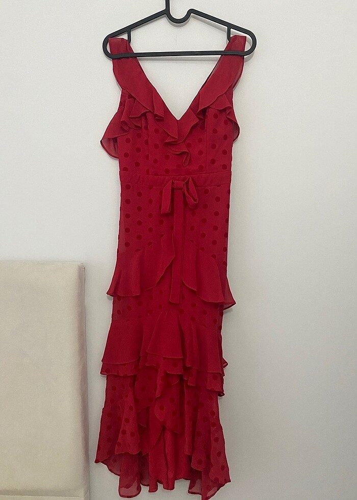 Kırmızı kabartma puantiyeli 34 beden abiye elbise xs s bedene olur bir kere giydim hiç bir sorunu yok