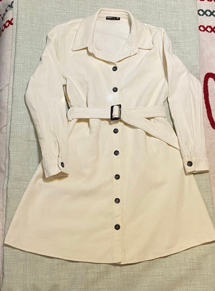 De Facto marka, pamuklu fitilli kadife kumaştan, ekru renkte, önü düğmeli, eteği A kesim, diz boyunda gömlek elbise. Kemerli ve cepli modeliyle hem rahatlık, hem şıklık sunar. Yıkandı ama hiç kullanılmadı. 40 beden, ölçüleri fotolarda mevcuttur.