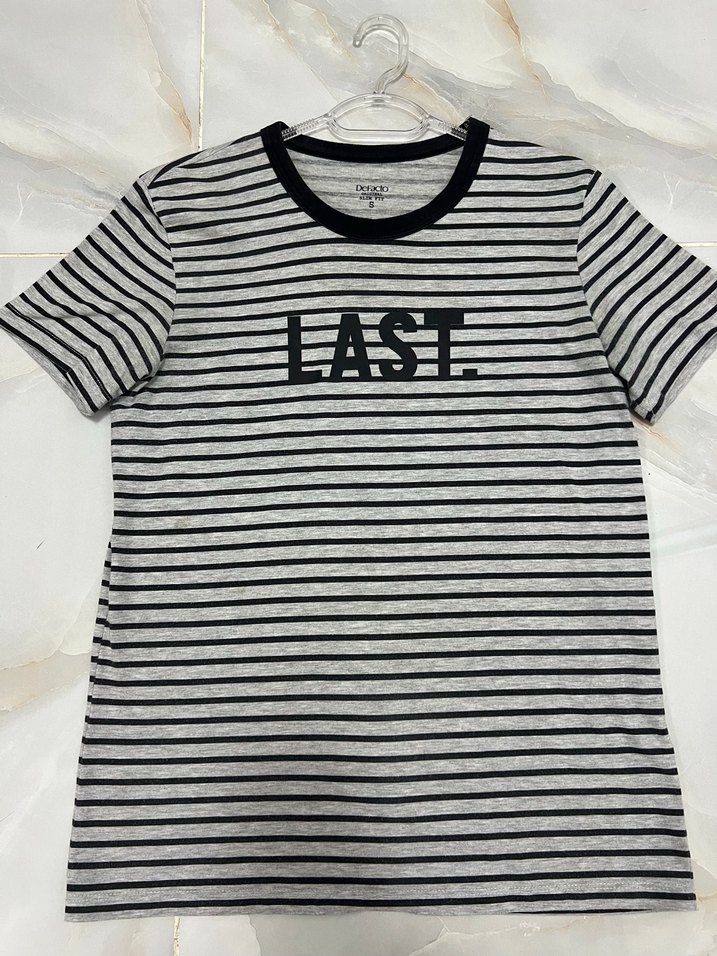Üründe herhangi bir deformasyon yoktur. Ürün ölçüleri fotoğraflarda mevcuttur. Pamuklu, kısa kollu, gri çizgili tişört.