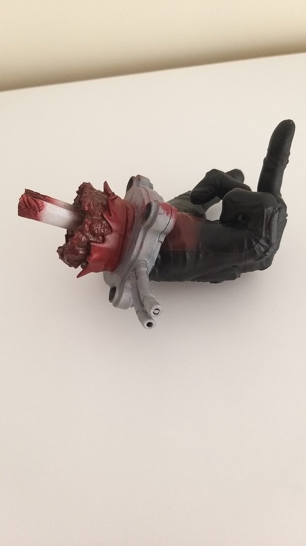 Kırmızı ve siyah renklerde detaylı işçilikle yapılmış, kırık sigara tutan el şeklinde karanlık bir aksiyon figürü.