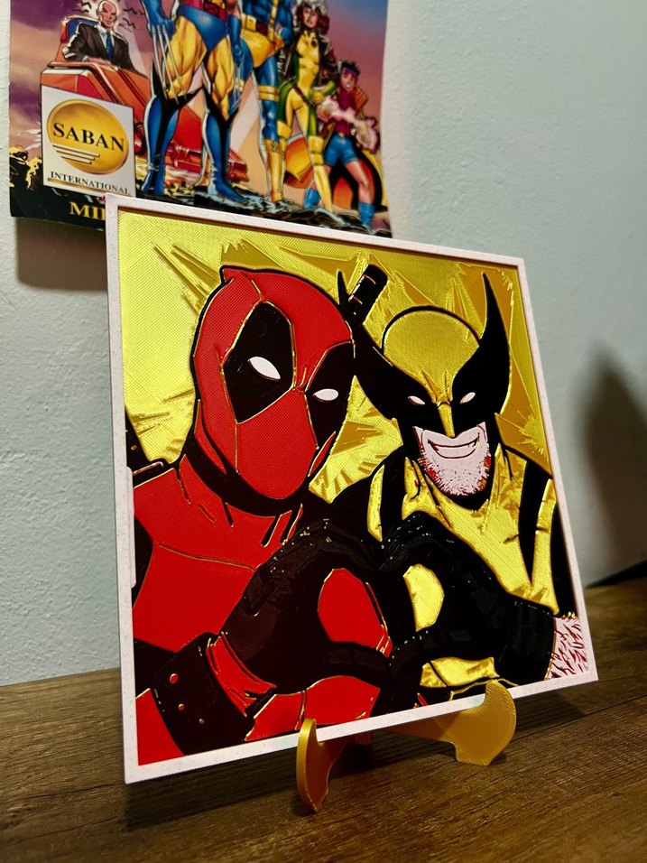 Deadpool ve Wolverine tablosu, 20x20 cm boyutunda. İsterseniz duvara isterseniz masanızda sergileyebilirsiniz. 3D baskı makinesi ile kendimiz yaptık. Hiçbir sıkıntısı yok sıfır yeni baskı ürün