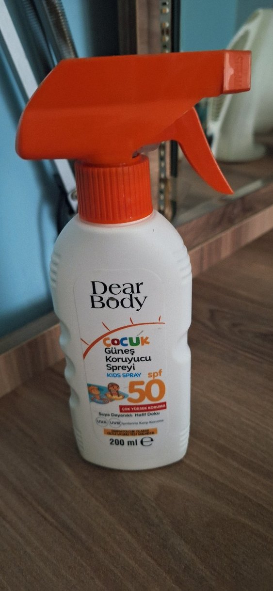 Dear Body çocuklar için 200 ml sprey formda, yüksek koruma sağlayan SPF 50 güneş koruyucu üründür.