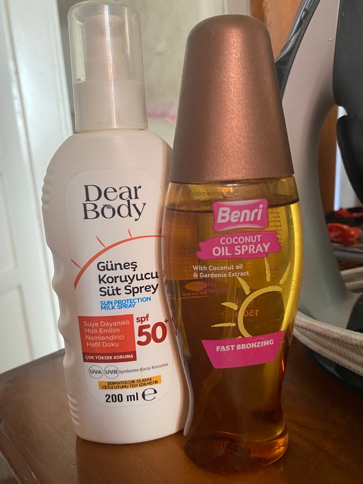 Dear Body SPF 50 güneş koruyucu süt sprey, yüksek UVA ve UVB koruması sağlar, yumuşak ve nemlendirici dokudadır. Benri hindistancevizi yağlı sprey hızlı bronzlaşmaya yardımcı olur. ☀️