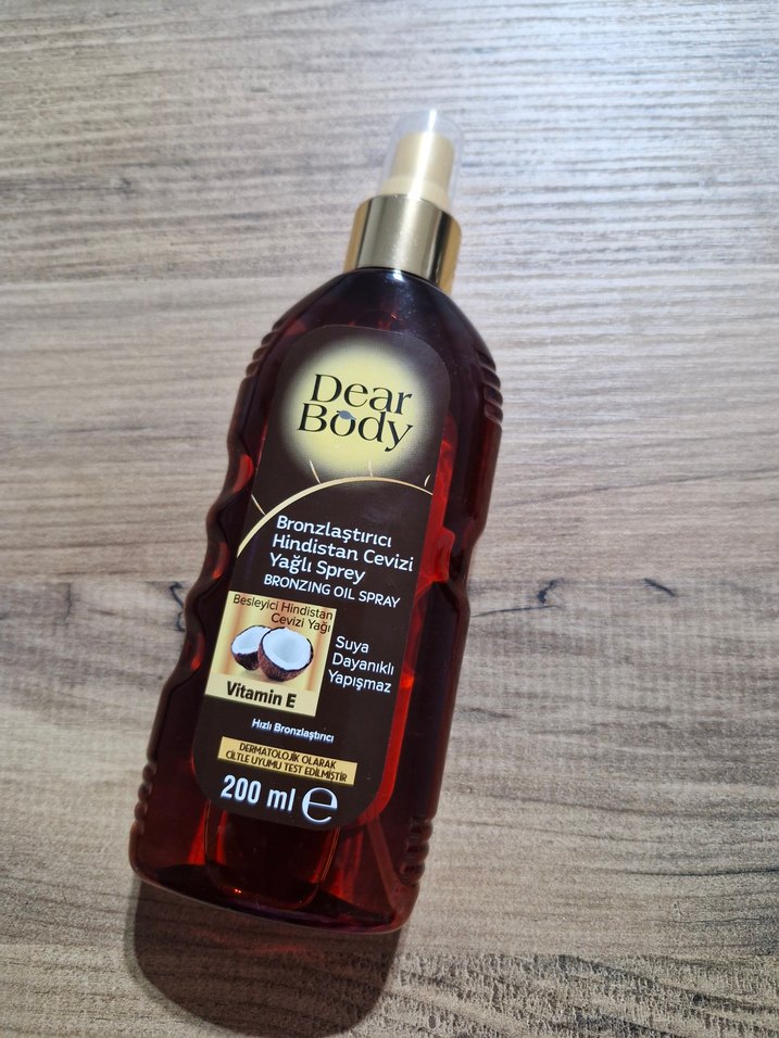 Dear Body Hindistan cevizi yağı ve E vitamini içeren, suya dayanıklı ve yapışkan olmayan bronzlaştırıcı yağ sprey, 200ml. ihtiyac fazlası son kullanma tarihi 04.2028 dir hepsıburadadan alındı bronzlastırıcı hiç kullanılmadı kutu ıle gonderım yapılacaktır #bronzlaştırıcı #güneşkremi #krem #dearbodyyağ #güneşyağı