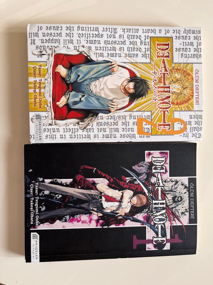 Death Note manga kitapları, 1 ve 2. ciltler, detaylı kapak ve hikaye metni içerir.