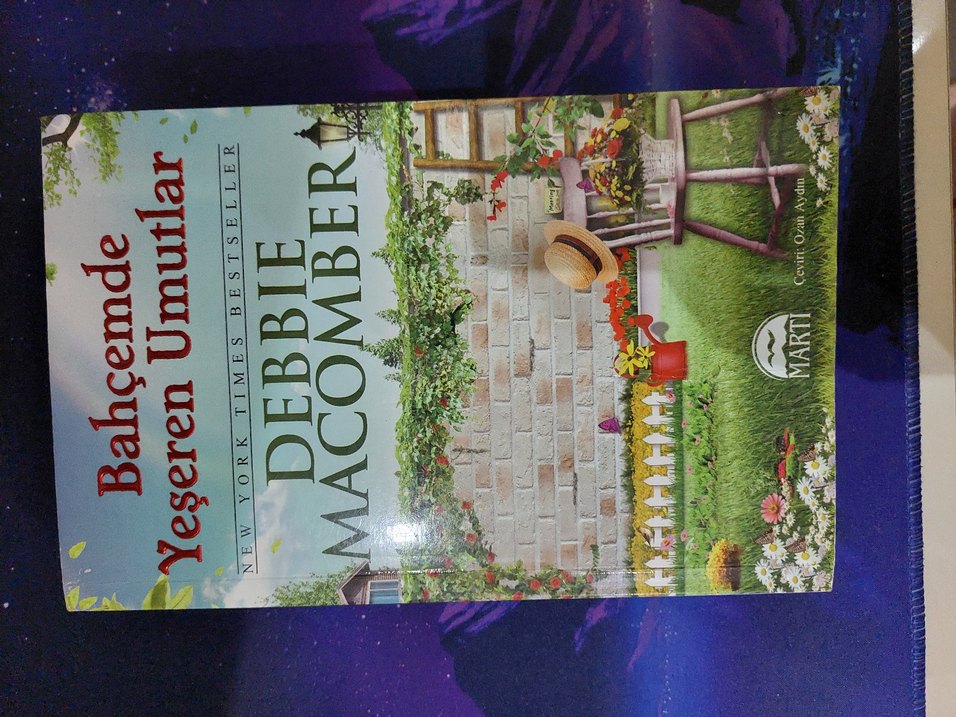 Debbie Macomber tarafından yazılmış, çiçekler, şapka ve bahçe aletleriyle huzurlu bir bahçe sahnesi içeren roman. 0 gibidir. Bir sıkıntısı yoktur.