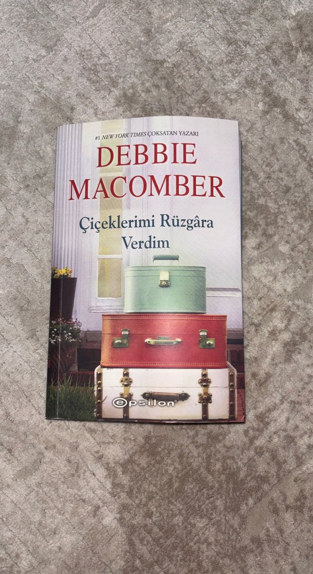 Debbie Macomber'ın 'Çiçeklerimi Rüzgara Verdim' adlı romanı, üzerinde üst üste konmuş eski bavullar ve çiçeklerin yer aldığı kapağa sahiptir.