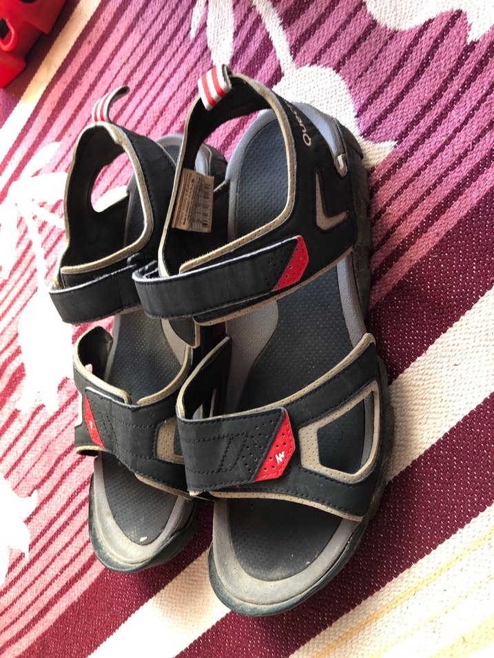 Kırmızı ve koyu tonlarda desenli, lastik tabanlı, cırt cırtlı erkek spor sandalet. Sokak stili ve günlük kullanım için uygundur.