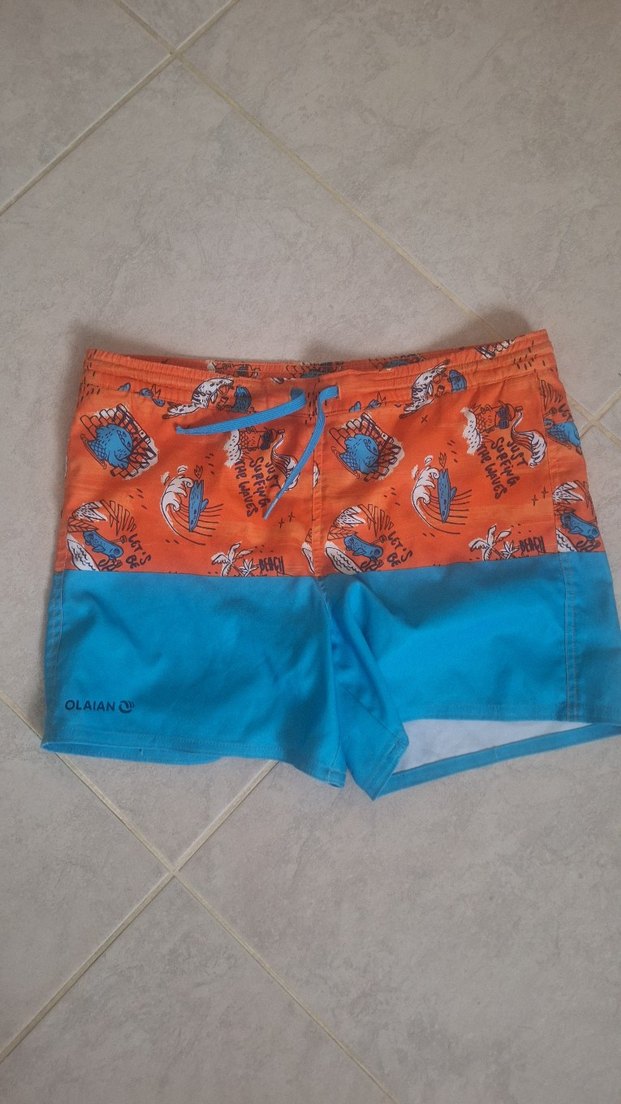 decathlon mayo 10 yas Canlı turuncu ve mavi renklerde, baskılı desenli erkek çocuk mayo şortu. Belde bağcıklı ve OLAIANC marka logosu bulunur.