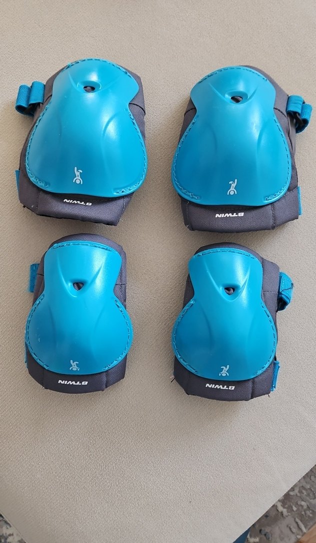 Koyu mavi renkli, plastik dış kaplamalı dizlik ve dirsek koruyucu, bantlarla sabitlenir. az kullanildi. Bisiklet ve paten kullanimi icin uygun 4-5 yaş için uygun