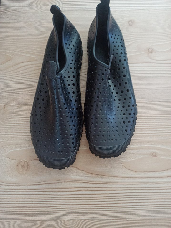 Delikli, siyah lastik Deniz havuz ayakkabısı, minimalist ve şık tasarıma sahip. Günlük kullanım için uygundur.