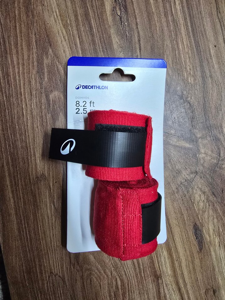 Decathlon marka, 2.5 inç genişliğinde ve 8.2 fit uzunluğunda, baskılı desenli renkli kırmızı boks bandajı