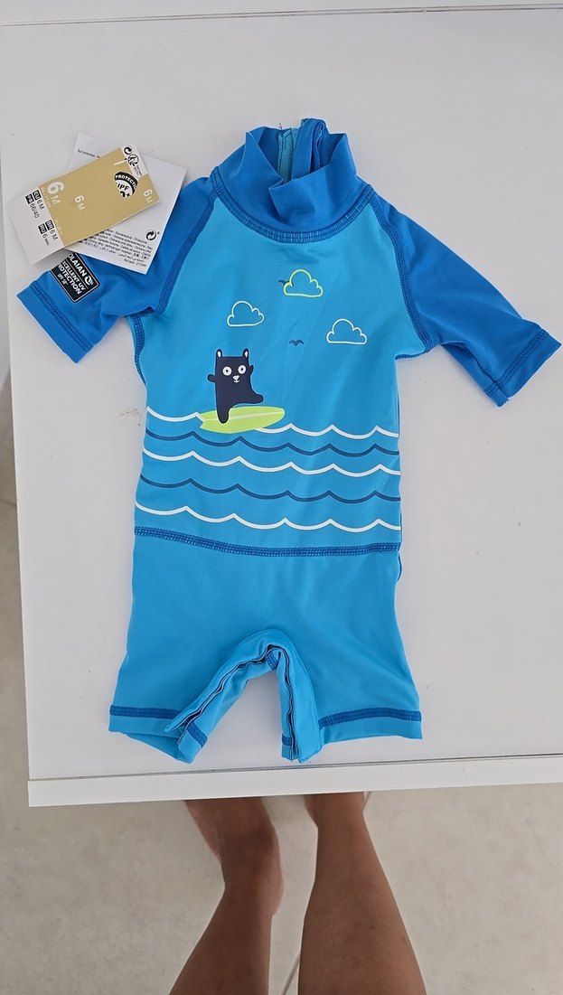 Decathlon marka 3_6 aylık Erkek bebek Mavi uv50 korumalı Mayo. Erkek 3_ 6 aylık bebek için kısa kollu ve şortlu, canlı mavi renkte, deniz ve ayı desenli mayo.