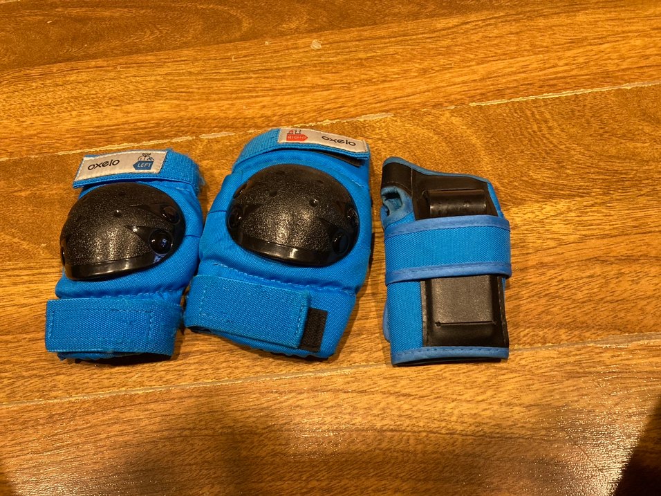 Mavi renkli, yumuşak kumaş ve lastik bantlı biker tarzı diz, dirsek ve bilek koruyucu pedler, desensizdir. Eşleri mevcuttur.