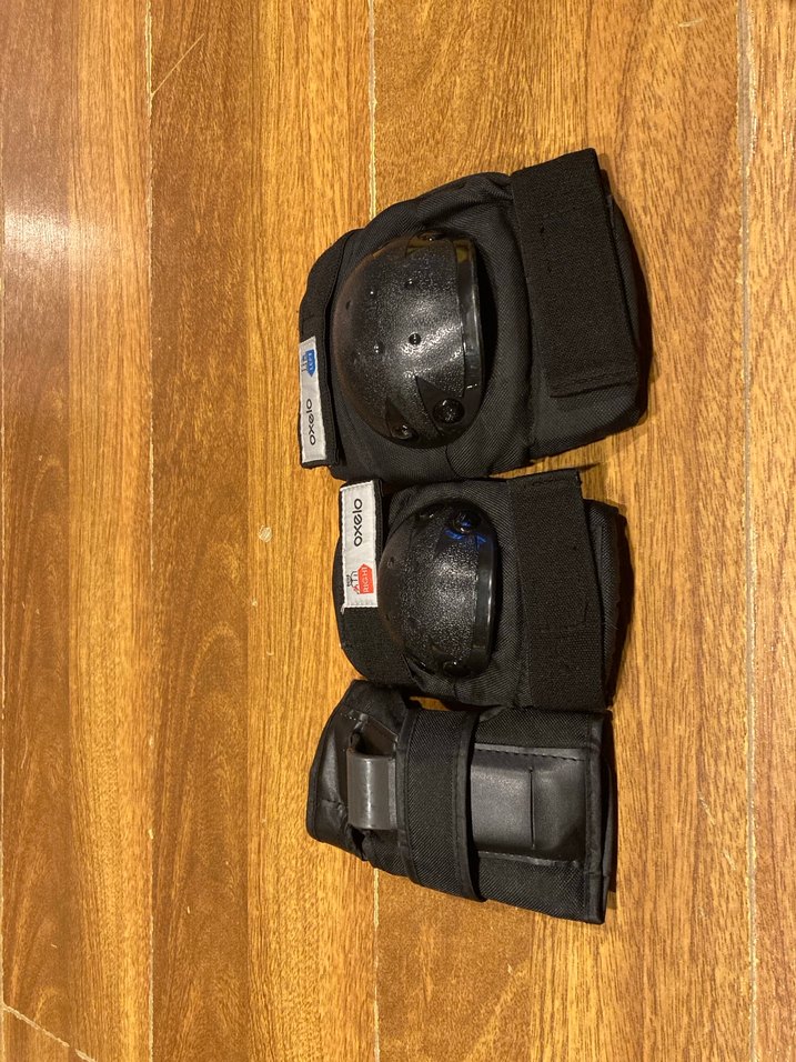 Siyah renkli, yumuşak kumaş ve lastik bantlı biker tarzı diz, dirsek ve bilek koruyucu pedler, desensizdir. Eşleri mevcuttur.