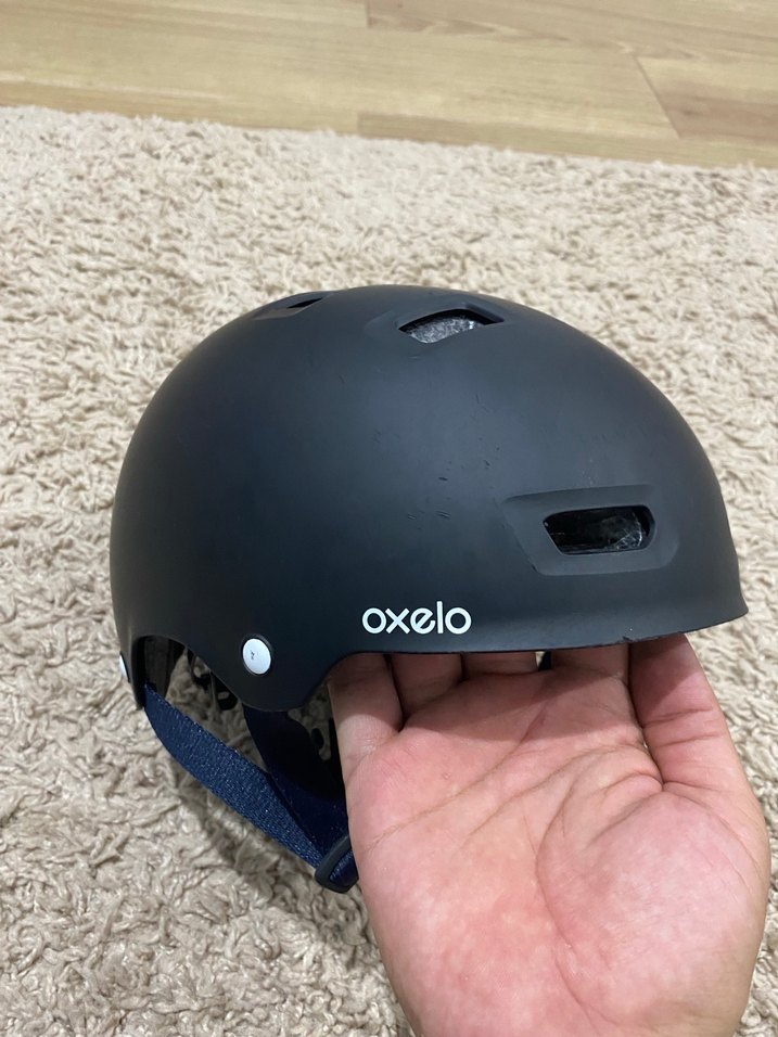 Oxelo marka siyah paten scooter bisiklet kaskı, baskılı desen ve cırt cırtlı kayış ile, koyu renkli lastik malzemeden yapılmıştır. Decathlon kaskı scooter için almıştık sadece bir defa taktı ve sevmediği için çıkardı attı takmadı. O yüzden çizimler bağlı ama bir defa taktı 10 dk durmadı bile