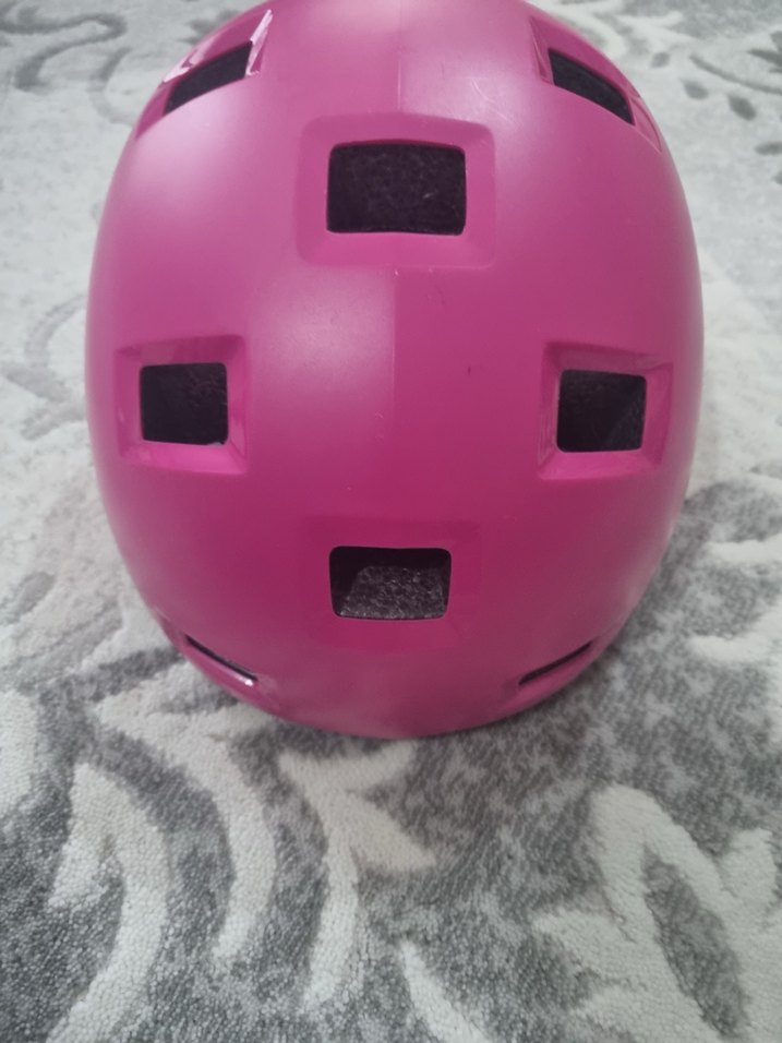 Pembe renkli, plastik malzemeden yapılmış biker tarzı motosiklet kaskı. Çoklu havalandırma delikleri ve ayarlanabilir Velcro kayış içerir. Canlı renklidir.