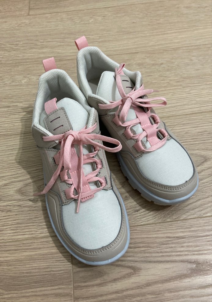 Pembe bağcıklı kadın spor ayakkabısı, ince topuklu ve lastik tabanlı, desensiz tasarımıyla günlük sokak stili için uygun.