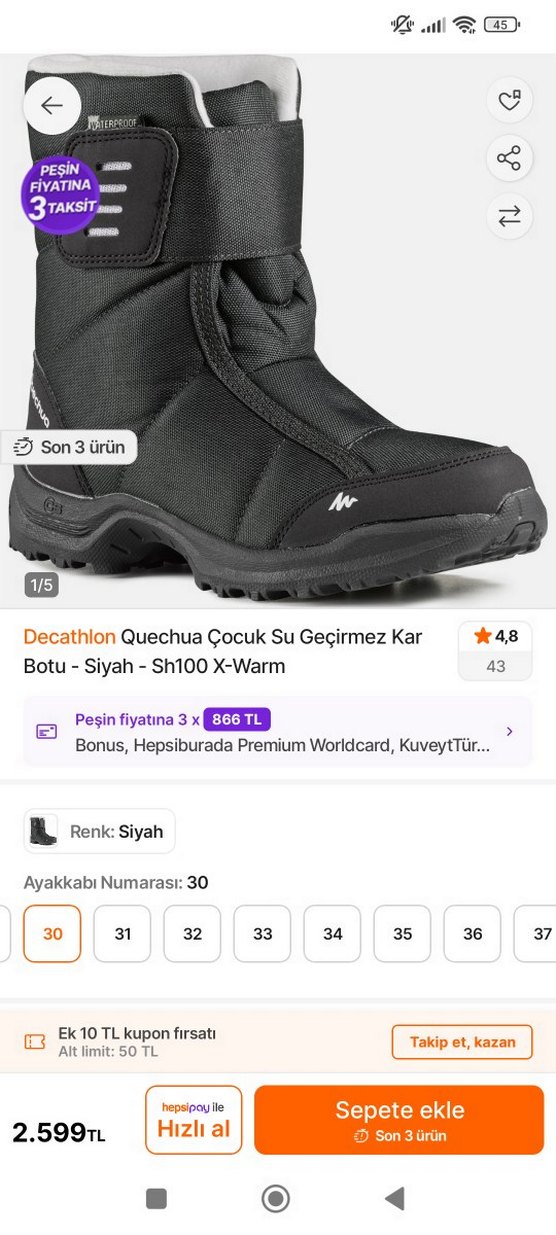 Decathlon Quechua Siyah Su Geçirmez Çocuk Kar Botu
