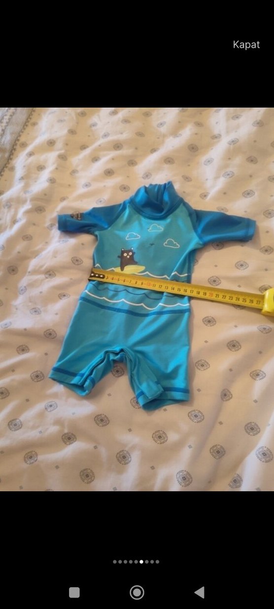 Kısa kollu, renkli baskılı erkek çocuk mayo, dalgalar ve sevimli karakter desenine sahiptir. en çok 10 kiloya kadar olur