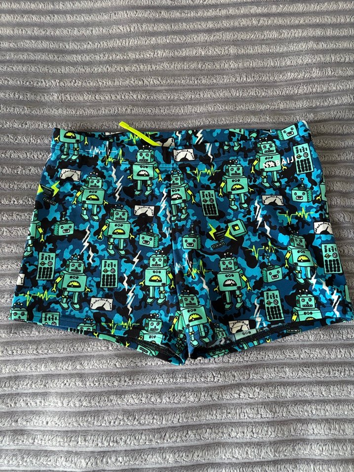 Decathlon Renkli robot desenleriyle süslenmiş, mavi tonlarında erkek mayo şortu. Hızlı kuruyan, rahat kumaştan üretilmiştir.