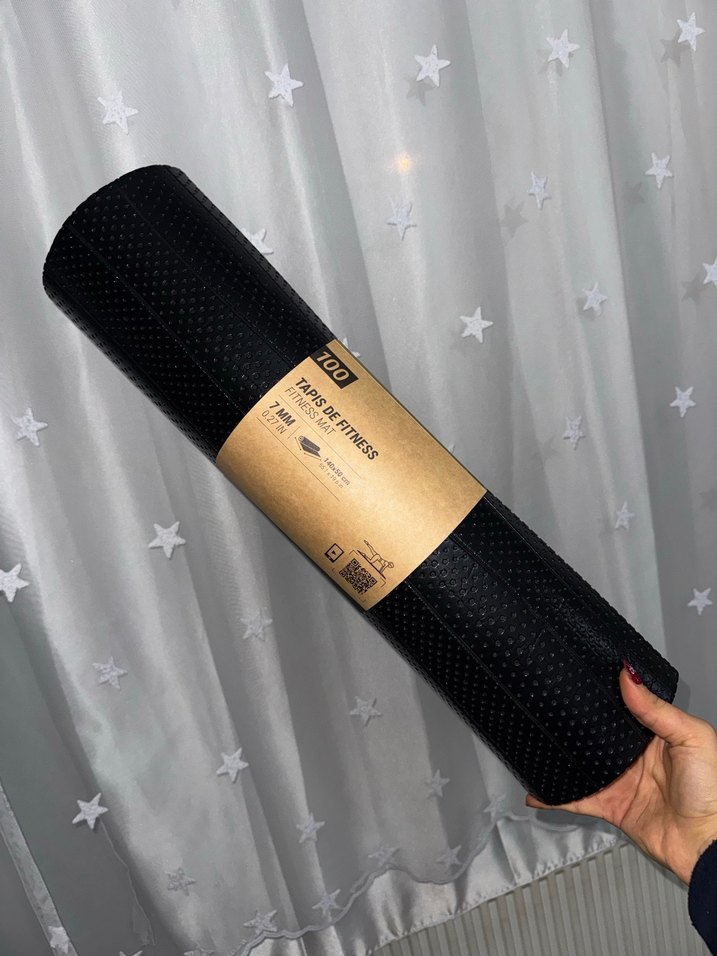 Siyah renkte, noktalı desenli egzersiz matı. Hafif ve kolay sarılır, rahat antrenman yüzeyi sunar. ♂️