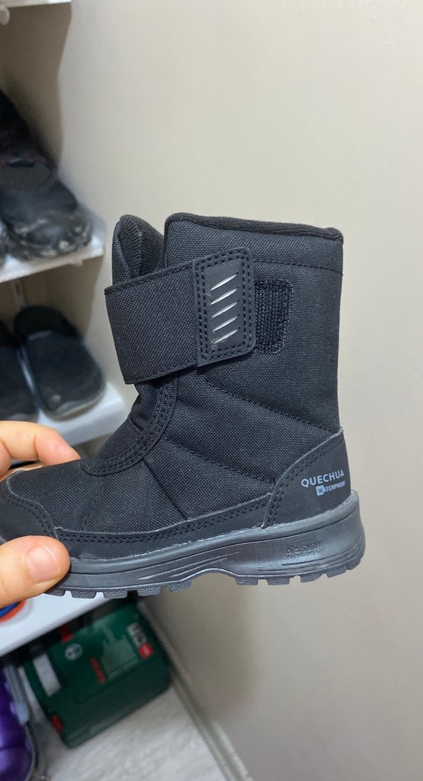 Decathlon marka siyah erkek çocuk botu, kaymaz kauçuk taban ve Velcro kapanışa sahiptir. Rahat sokak stiline uygundur. Bir kere kullanıldı