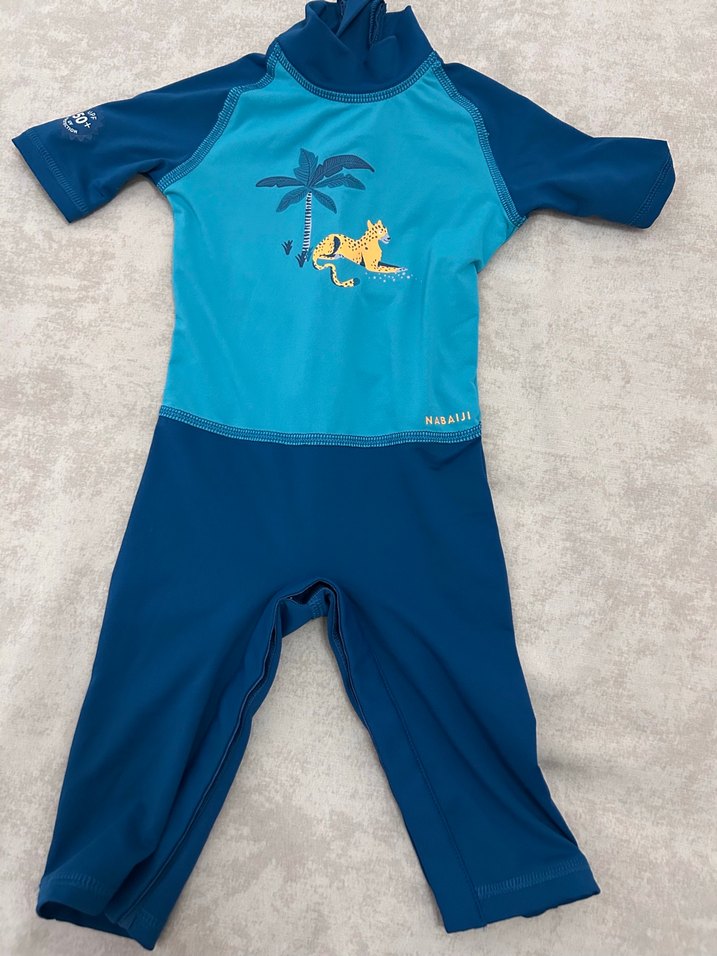 Kısa kollu, balıkçı yaka ve cırt cırtlı bebek mayo. 1 kere kullanıldı