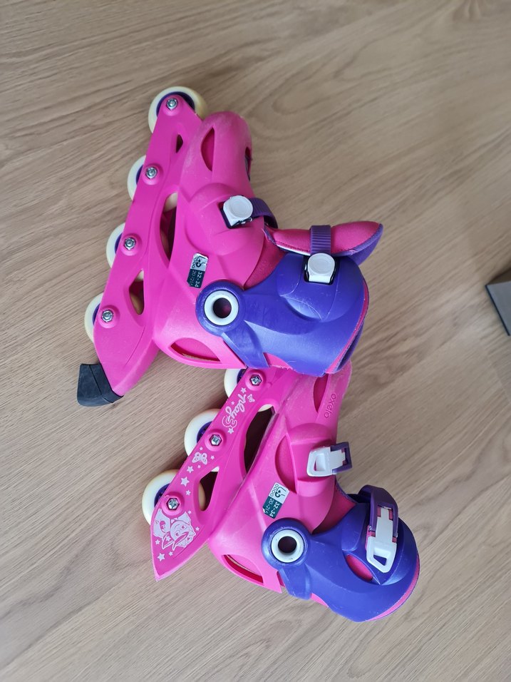 Ayarlanabilir kayışlara ve sağlam yapıya sahip renkli pembe çocuk patenleri, güvenli kayma deneyimi sunar.