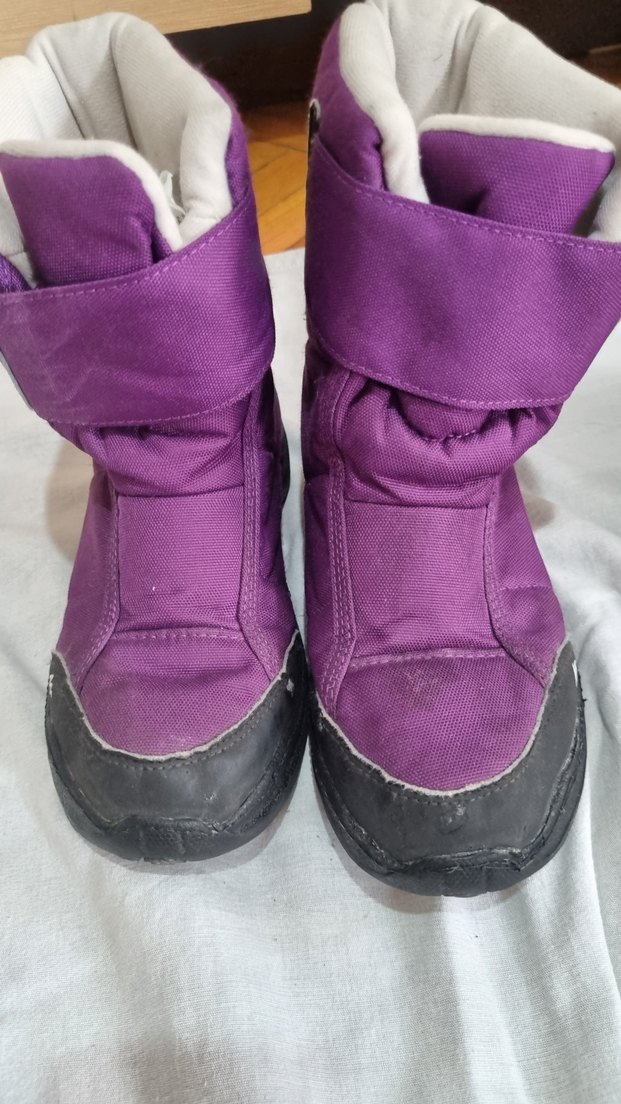 Mor kız çocukları için, kauçuk tabanlı ve cırtcırtlı bantlı botlar. Desensiz, sokak stili için uygun bir tasarıma sahip.