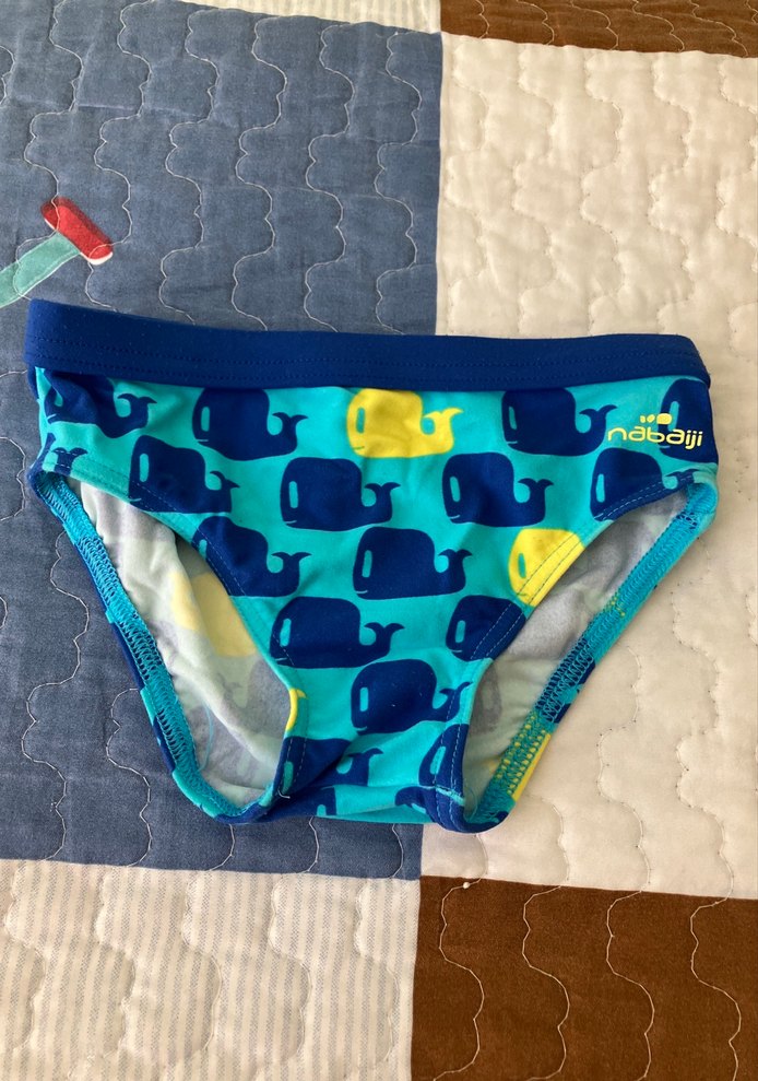 Dechatlon Mavi tonlarda renkli balina desenli erkek çocuk mayo, yumuşak ve rahat kumaştan üretilmiştir.