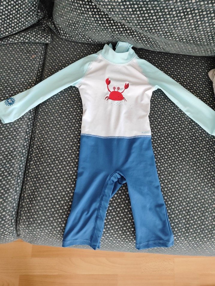 Uzun kollu erkek çocuk mayo, göğsünde kırmızı yengeç figürü ile rahat bir kumaştan yapılmıştır. hiç kullanılmadı alındığı gibi duruyor.