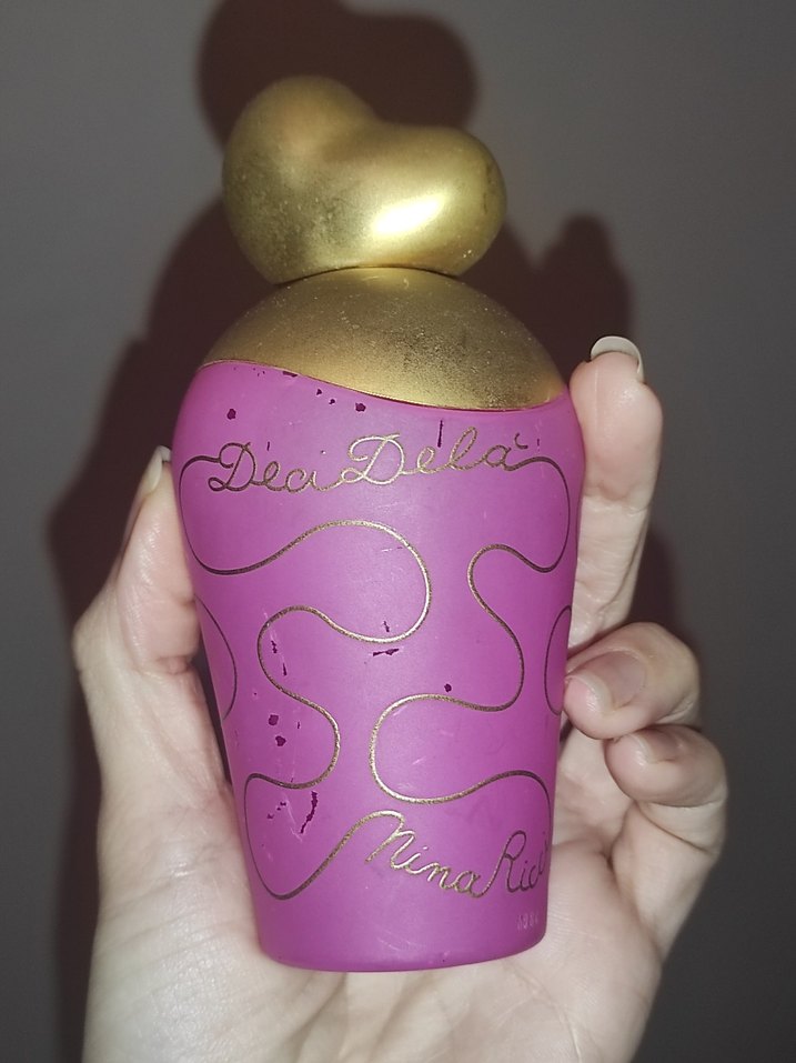 Deci Dela by Nina Ricci Vintage ve bulunmaz bir ürün tam nostalji severler için! Eski olduğundan şişede bazı kusurlar vardır. Altın detaylı pembe şişesi ve kalp şeklinde kapağı ile zarafet ve çekicilik sunar. Sadece boş şişesi satılıktır. 100 ml