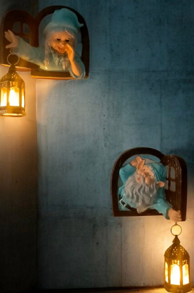 Mavi renkte, pencereden bakan cüce figürlü dekoratif mumluklar, elinde sıcak ışık veren fener tutuyor. ️