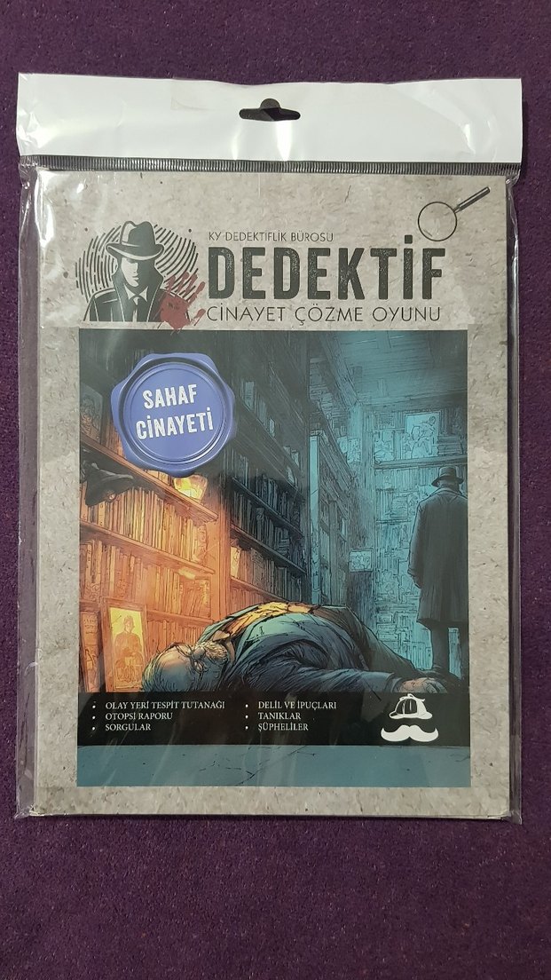 Sahaf Cinayeti adlı dedektif cinayet çözme oyunu, olay yeri raporu, deliller, tanıklar ve şüpheliler içerir. ️♂️