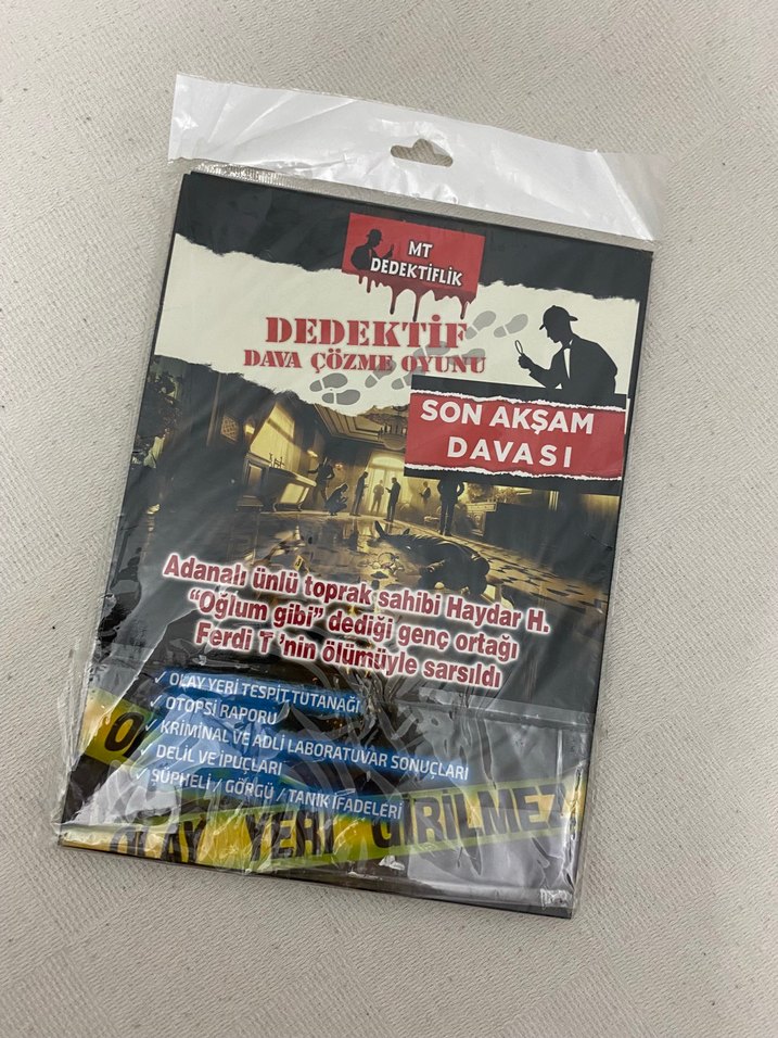 Adana'nın ünlü toprak sahibi Haydar H.'nin davasını çözme oyunu. Oğlum gibi dediği genç ortağı Ferdi Y.'nin ölümüyle sarsıldı. Soruşturma belgeleri ve raporlar içerir. Haydar ve Ferdi aynı kişi bu arada sadece ilk sayfada bu hata mevcut. Hikaye anlatımı başarılı çok küçük yazım hataları var ama fiyat performans başarılı. Çok zevkli bir oyun.