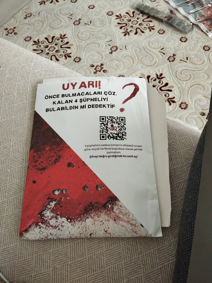 Bulmacalar çözülerek kalan dört şüpheliyi bulmayı sağlayan dedektif kitabı. İpucu ve çözümler için QR kodu içerir. ️♂️