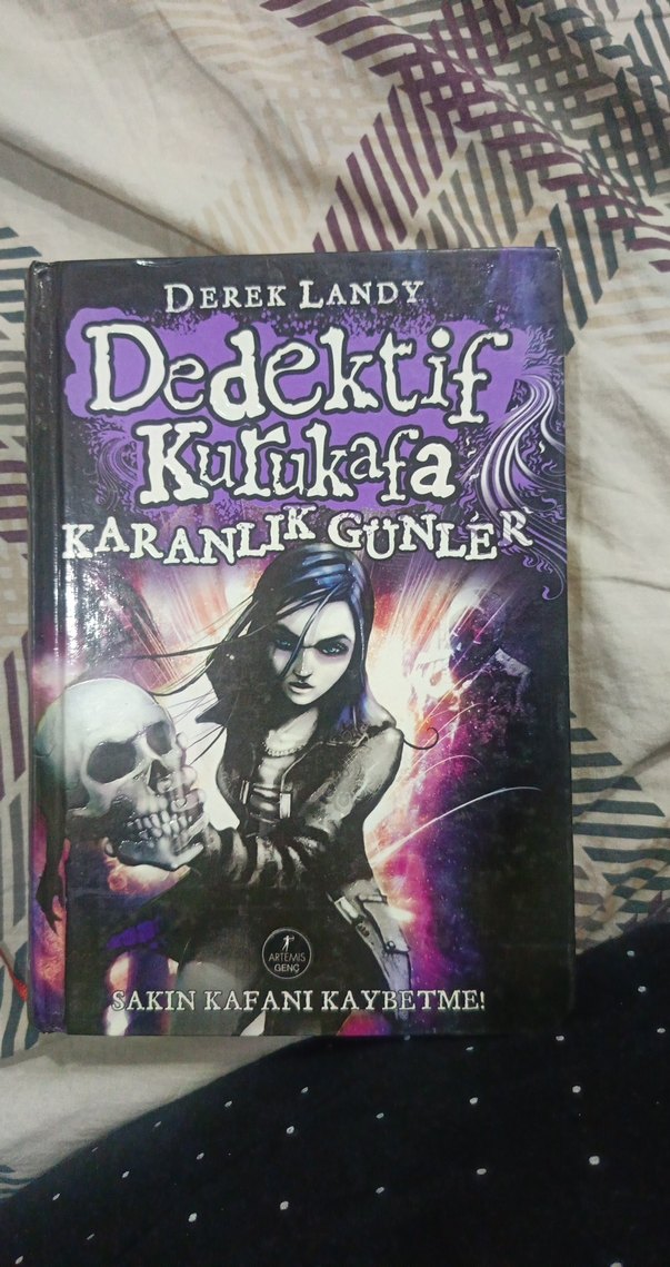 Derek Landy'nin 'Dedektif Kulukafa: Karanlık Günler' adlı romanı. Kapağında kafatası tutan kadın karakter var. "Sakın kafanı kaybetme!" ifadesi yer alıyor.