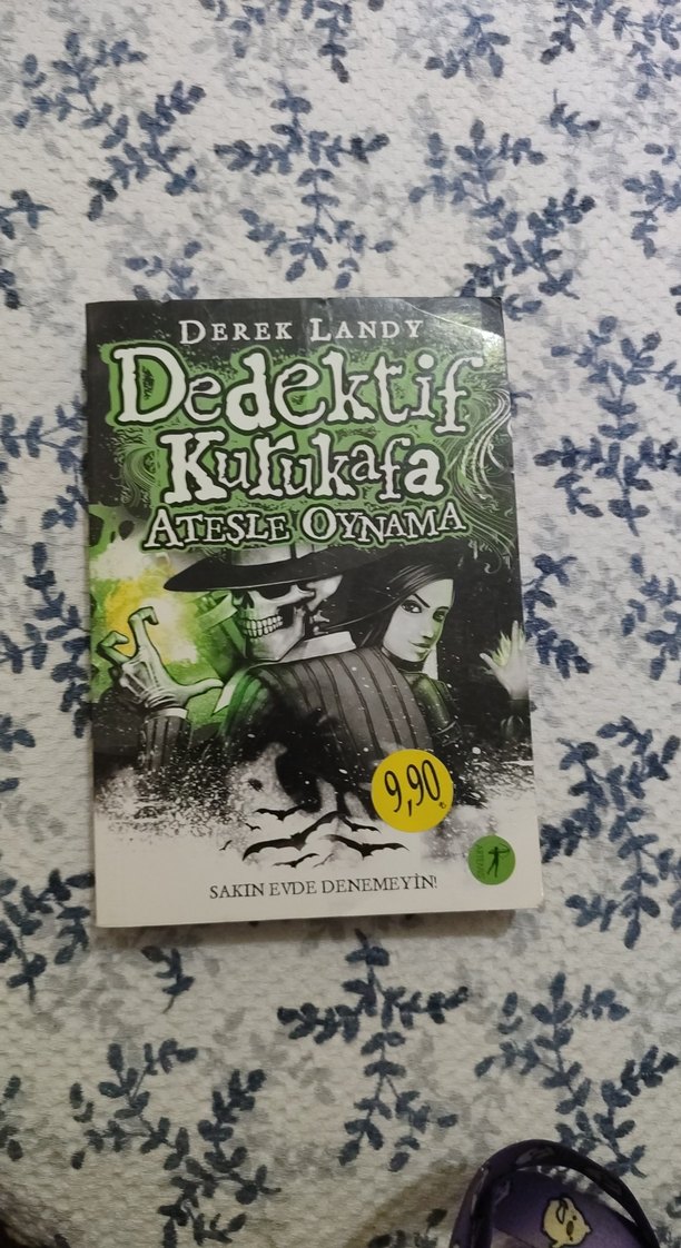 Derek Landy'nin 'Dedektif Kurukafa: Ateşle Oynama' adlı romanı, karanlık ve gizemli karakterlerle dolu heyecan verici bir hikaye sunuyor. Kapakta "Sakın evde denemeyin" uyarısı yer alıyor.