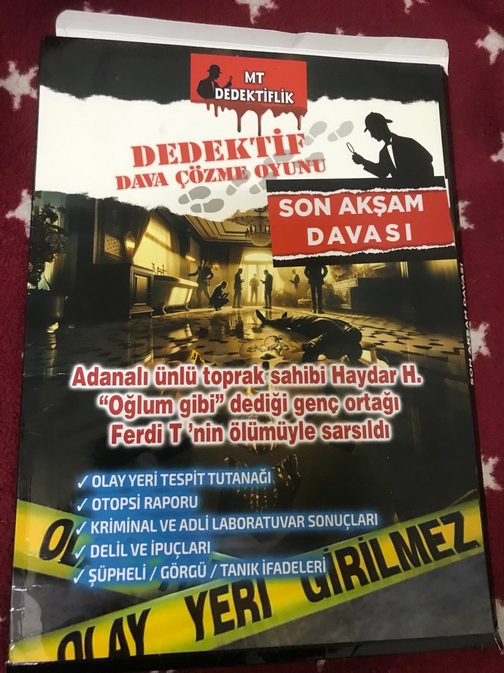 Olay yeri tespiti, otopsi raporu, kriminal laboratuvar sonuçları ve şüpheli ifadeleri içeren dedektiflik kitabı. Sadece itiraf mektubunda küçük leke var