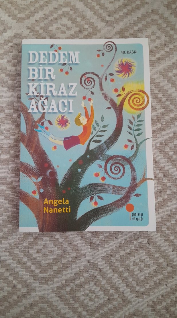 Angela Nanetti'nin yazdığı, kiraz ağacı ve çocuk figürlerinin yer aldığı renkli kapaklı sanat kitabı.