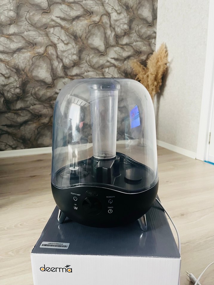 Deerma marka siyah hava temizleyici ve nemlendirici, şeffaf kubbe tasarımı ve kontrol düğmeleri ile modern bir görünüme sahiptir. Hava kalitesini artırır ve nem sağlar. ️