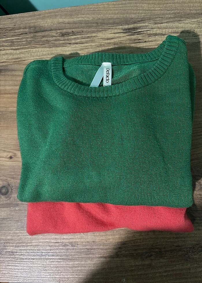 Defacto basic L beden kazak,yeşil ve nar çiçeği rengi. Çok az kullanıldı. İki ürün birlikte gelecektir.
